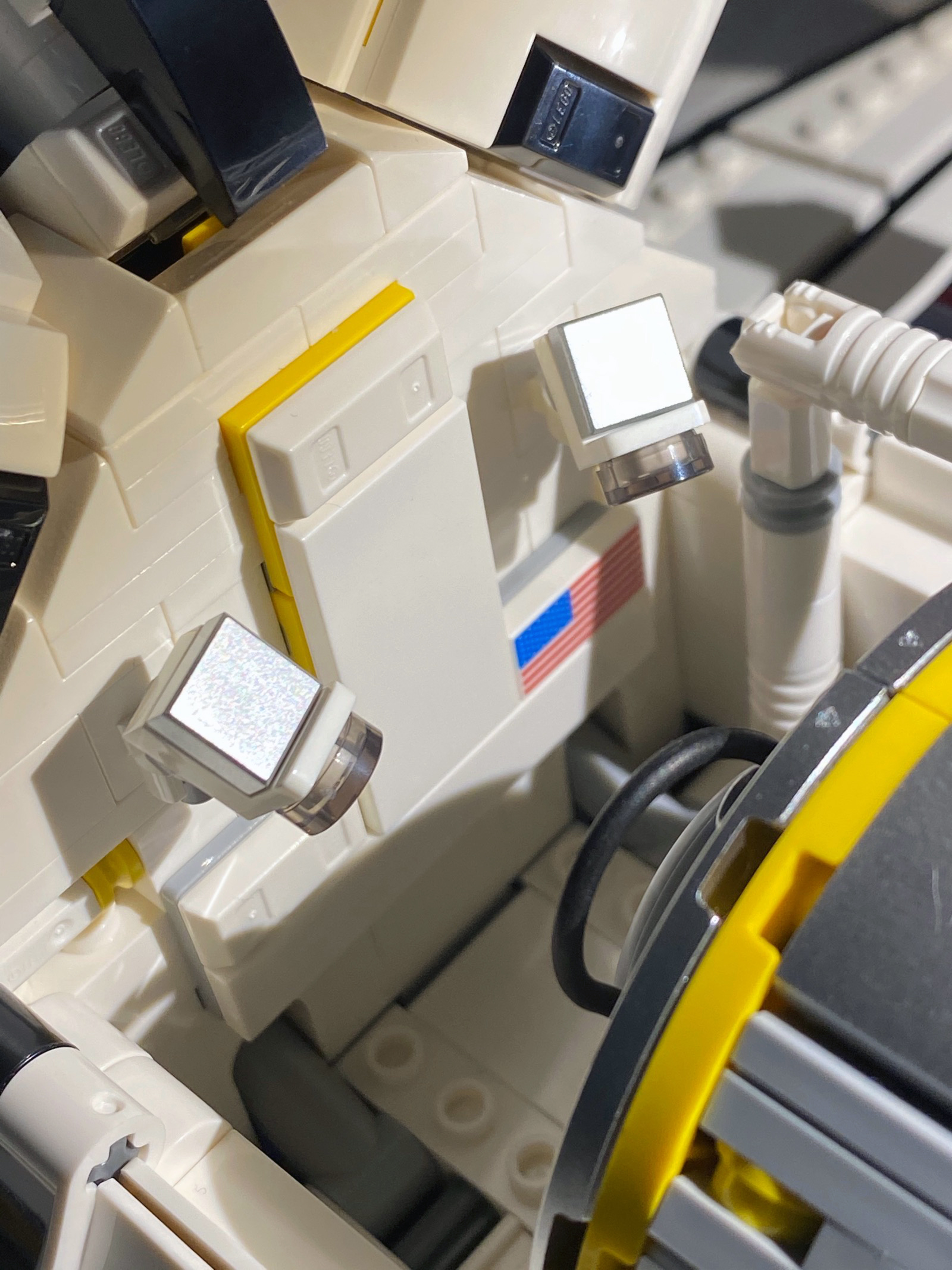 The reaction control thrusters on the rear are modeled, but if you look at the assembly, it seems a bit…over done. Isn’t there another way to fill the stud hole on the headlight bricks? This solution has the virtue of being a solid building effort, but flex-tube could have been inserted in the holes…