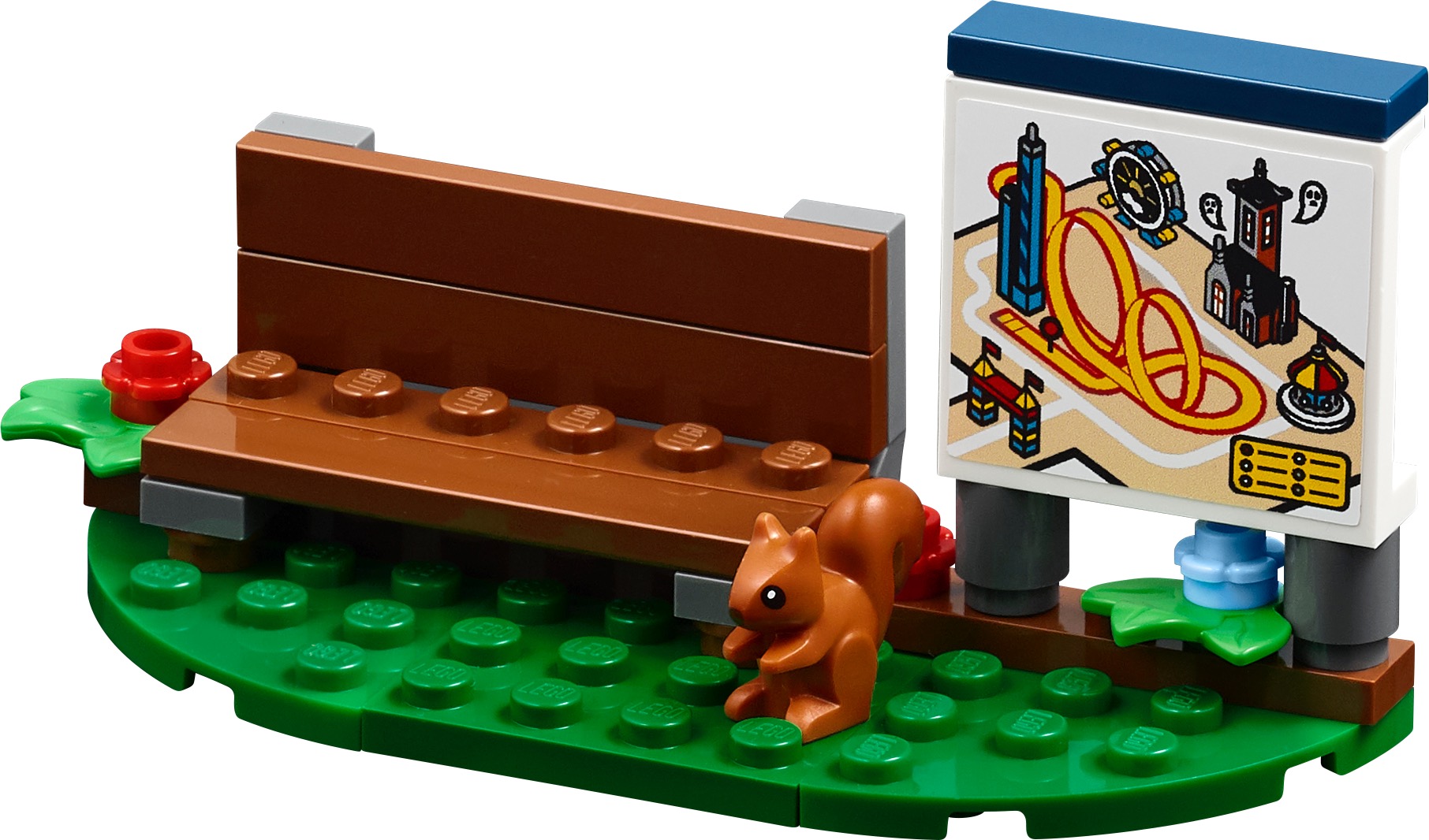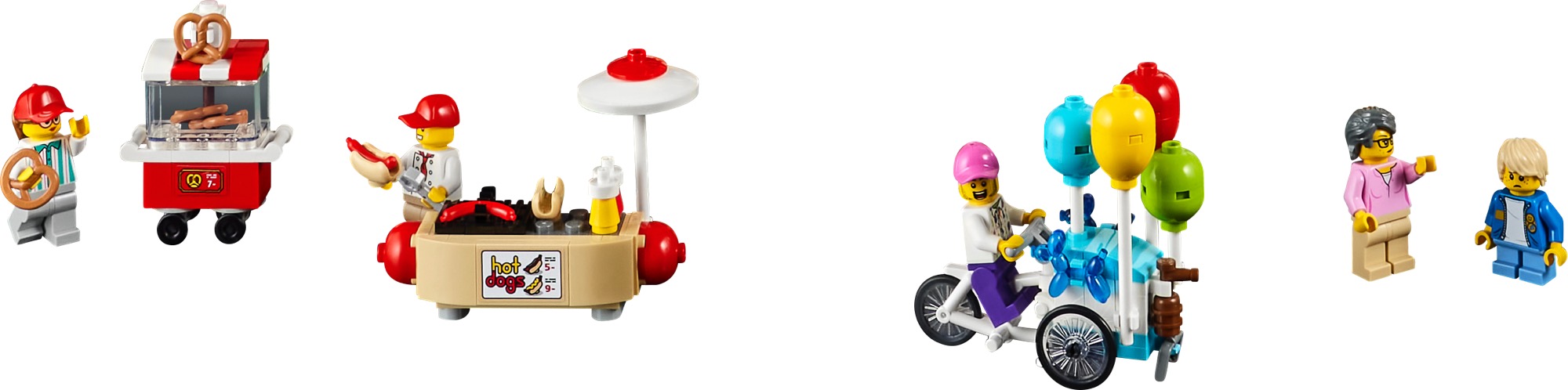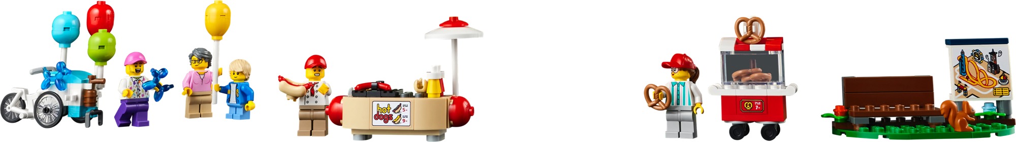 Guaranteed to generate a crowd, this playful set also contains eleven minifigures, including a ride operator, balloon seller, pretzel seller, hot-dog seller, a grandma, a young boy, and five rollercoaster riders.