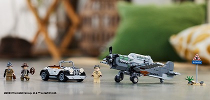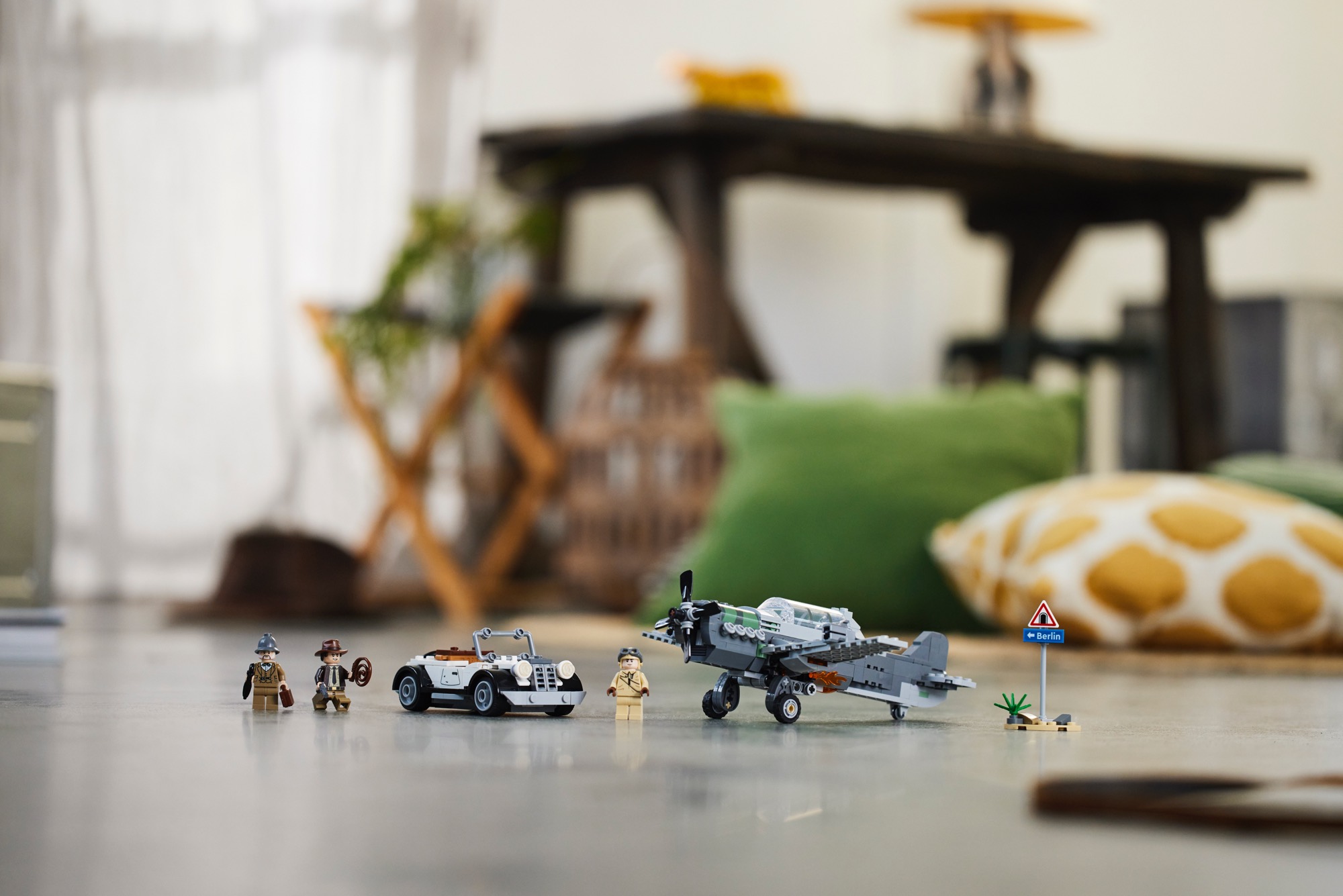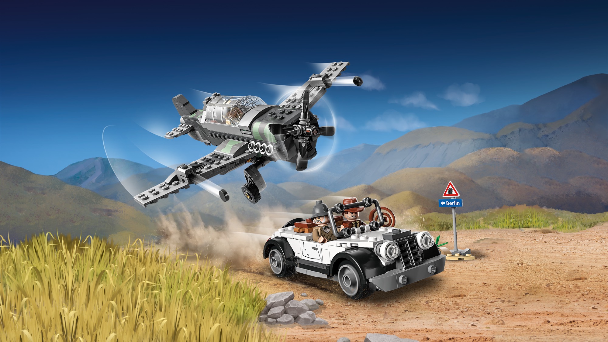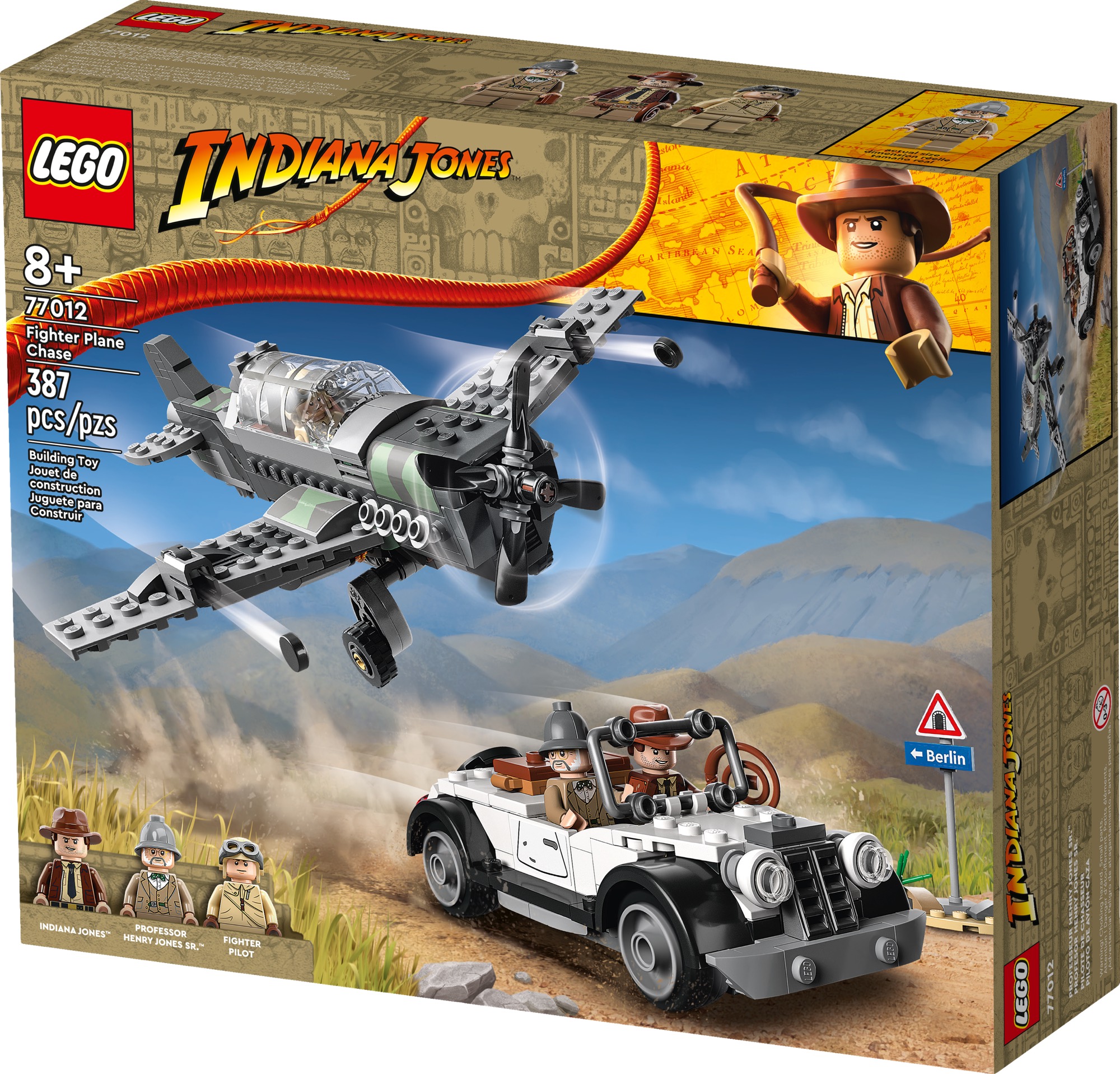 - 77012 LEGO® Indiana Jones™ Fighter Plane Chase building set encourages children to recreate an exciting scene from Indiana Jones and the Last Crusade movie. Grab Indiana Jones™ and his father Professor Henry Jones Sr.™ and hop into the vintage convertible car to outrun the fighter plane and escape the chase. This set comes with 3 minifigures: Indiana Jones, his father Professor Henry Jones Sr.™ and a fighter pilot for adventures that await in this 387-piece playset.