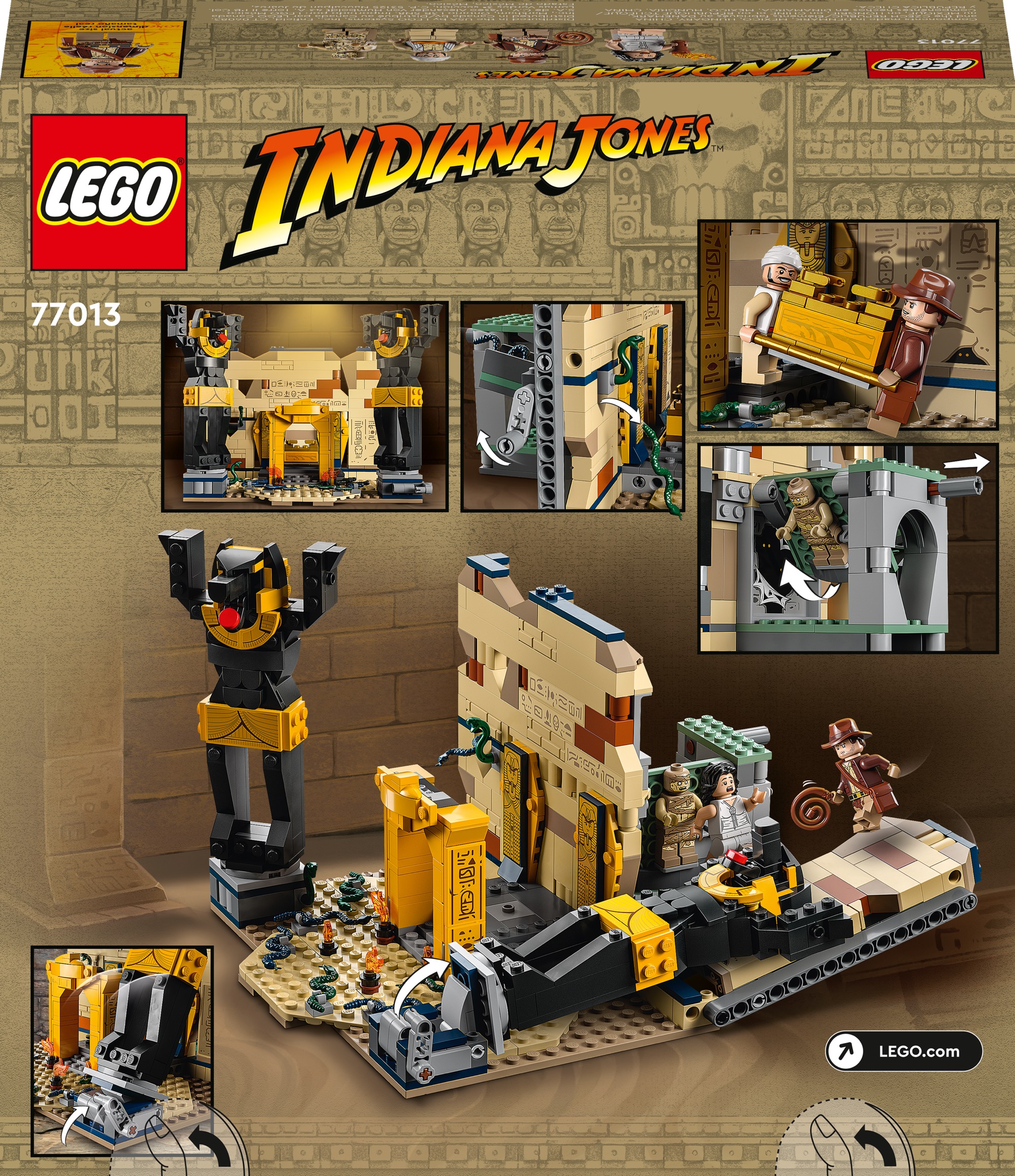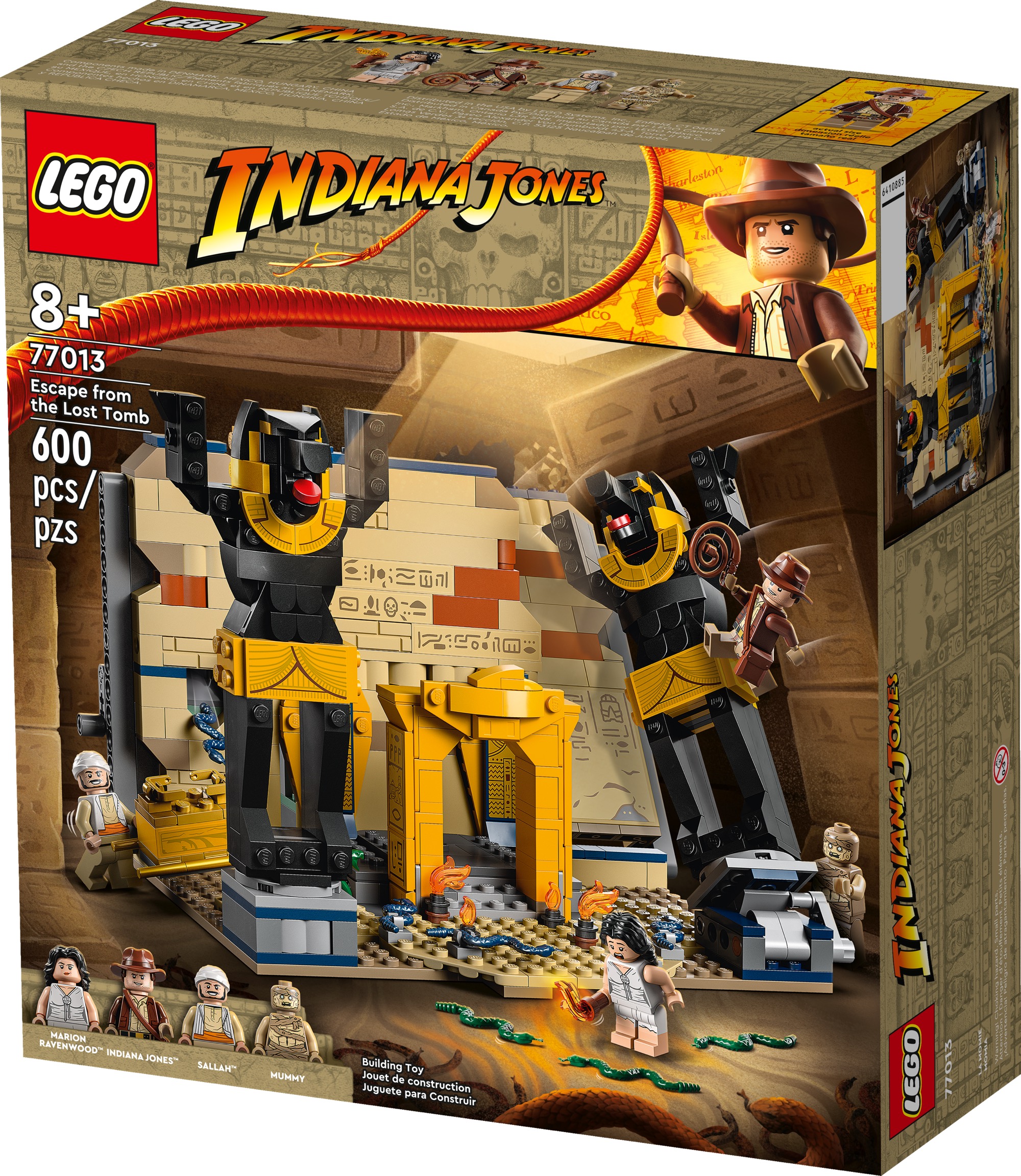 - 77013 LEGO® Indiana Jones™ Escape from the Lost Tomb building set provides hours of thrilling adventure with this detailed playset inspired by the Indiana Jones and the Raiders of the Lost Ark movie. Help Indy search for the Ark of the Covenant in the snake infested Well of Souls and escape by climbing the massive Anubis statue and finding the hidden passage. With 600 LEGO pieces, this interactive playset will provide endless hours of fun for children and parents together.